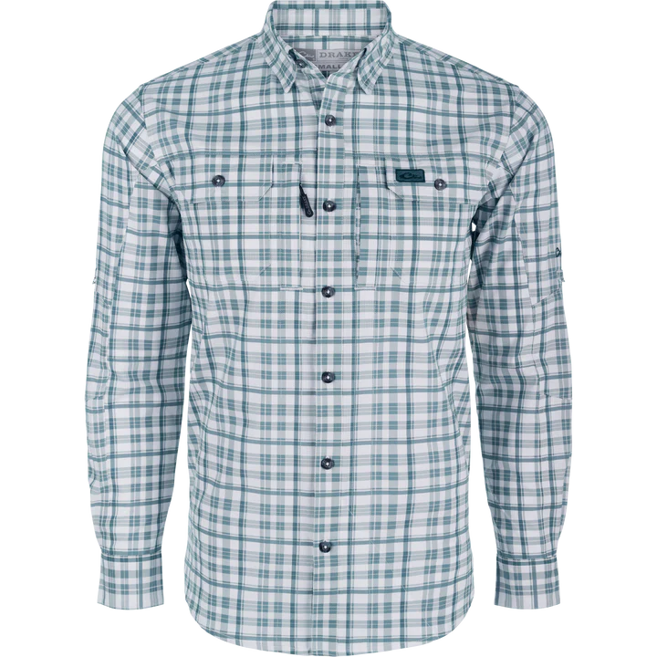 The Drake Hunter Creek Window Pane Plaid Shirt combines comfort and technology by using a unique micro-mesh weave made from 100% polyester. This performance fabric is lightweight at 120 GSM which allows moisture to wick quickly from the body. The micro-mesh provides natural ventilation and has SILVADUR antimicrobial technology to keep the shirt fresh and odor free. It also has a UPF30 rating for sun protection plus it has natural stretch for ease of movement. The Drake Hunter Creek Window Pane Short Sleeve shirt is packed with features: a classic fit, a hidden button-down collar, a vented back cape, two buttons through flap chest pockets with a covered hidden zipper pocket on the right pocket and a Magnattach closure on the left pocket. It has a sculpted hem which allows you to wear tucked or untucked. Inside the hem is a built-in sunglass wipe. Classic styling and technical features make the Drake Hunter Creek Window Pane Shirt a high performance and functional shirt you will enjoy for years to come.
